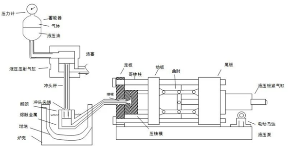 壓鑄設(shè)備將電機(jī)的電能通過馬達(dá)轉(zhuǎn)換為泵的液壓能,從而進(jìn)行動(dòng)作(即打開和關(guān)閉模具以及噴射熔化金屬進(jìn)入模具型腔)。