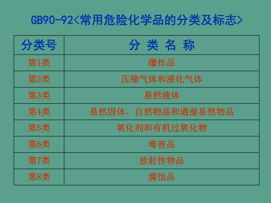 常用危險(xiǎn)化學(xué)品在《常用危險(xiǎn)化學(xué)品的分類及標(biāo)志(GB 13690-92)》中按危險(xiǎn)特性分為8類:(順序和危險(xiǎn)等級沒有關(guān)系)