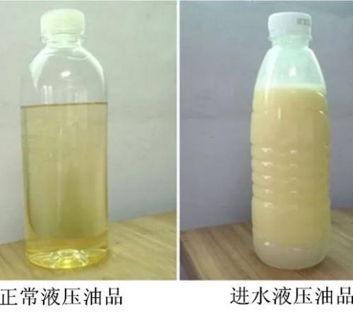液壓油和水不相溶,且油的密度比水小,當油水混合時在溫度、振動、壓力等的作用下,互相包裹形成無數(shù)的微小分隔面,在光的折射作用下顯現(xiàn)白色,肉眼觀察呈奶白色。