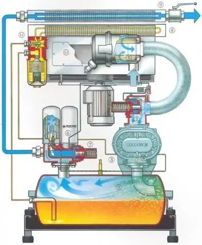 1.進(jìn)氣過濾器 2.多功能進(jìn)氣控制閥 3.注油管路 4.壓縮機(jī)機(jī)頭\轉(zhuǎn)子室 5.油氣預(yù)分離器罐 6.精細(xì)油氣分離器 7.最小壓力止回閥 8.油冷卻器 9.壓縮空氣冷卻器 10.油過濾器 11.溫控閥 12.清潔口