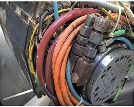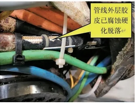 設(shè)備廠家維修拆開主軸內(nèi)部發(fā)現(xiàn),各種電氣管線都附著一些黃褐色物質(zhì),金屬表面已出現(xiàn)銹蝕現(xiàn)象,部分電氣管線外層膠皮已腐蝕硬化脫落,個(gè)別管線內(nèi)部已進(jìn)入切削液,故障分析之后發(fā)現(xiàn)與切削液有關(guān)。因?yàn)橹鬏S管線內(nèi)部結(jié)構(gòu)復(fù)雜且腐蝕程度已造成故障隱患,需要對(duì)管線整體進(jìn)行更換,但機(jī)床配件進(jìn)口周期較長(zhǎng),造成長(zhǎng)時(shí)間停機(jī)維修,損失較大。