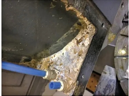 原因二,車間劃線工序?yàn)榱嗽诠ぜ鲃澇銮逦木€條,一直在毛坯表面涂一層白色石灰水,長(zhǎng)時(shí)間的應(yīng)用使得大量石灰水混合在切削液內(nèi),切削液硬度升高,導(dǎo)致切削液皂析出,造成機(jī)床密封處積有附著力很強(qiáng)且較難去除的結(jié)垢物質(zhì),致使機(jī)床密封性能下降。