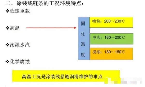 工件表面涂漆后,要進(jìn)入烘爐烤漆,也就是說,懸掛輸送鏈需要反復(fù)進(jìn)入高溫區(qū),每次進(jìn)入高溫區(qū)的時間約幾十分鐘。這就要求鏈條用潤滑劑應(yīng)滿足: